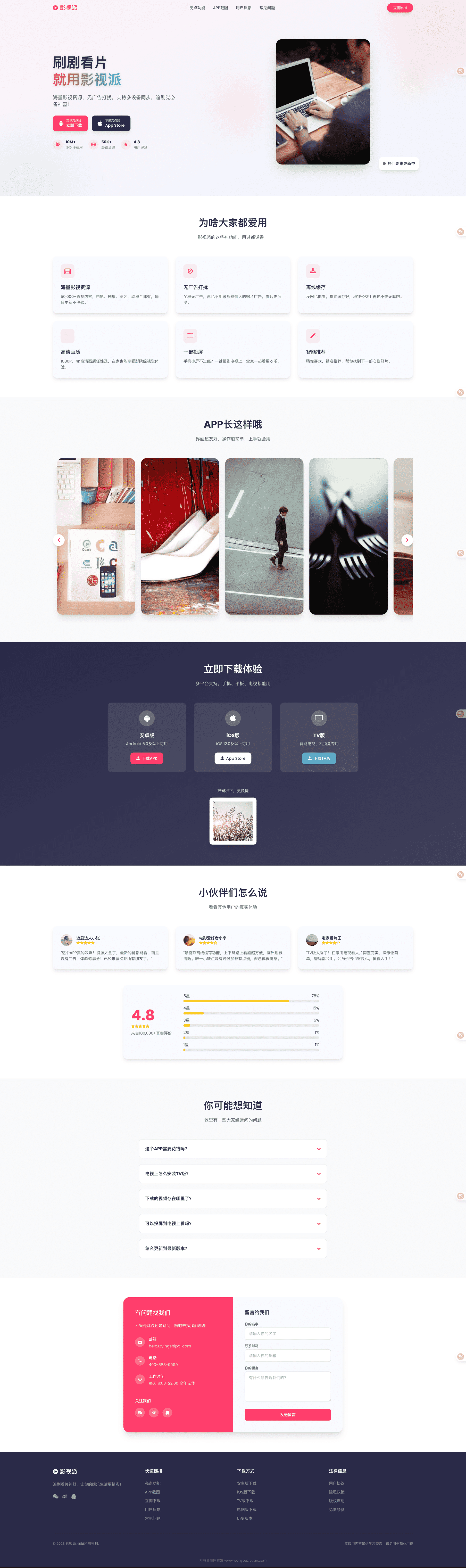 影视派 APP 下载页,专为年轻追剧党打造的刷剧神器!提供安卓、iOS、TV 多平台下载,含 50000 + 影视资源,每日更新无广告打扰,支持离线缓存与多设备同步。页面设计活力十足,展示 4.8 高分用户评价与真实反馈,清晰引导下载流程,搭配常见问题解答降低决策门槛,扫码或点击即可快速获取,让你随时随地沉浸式看片!