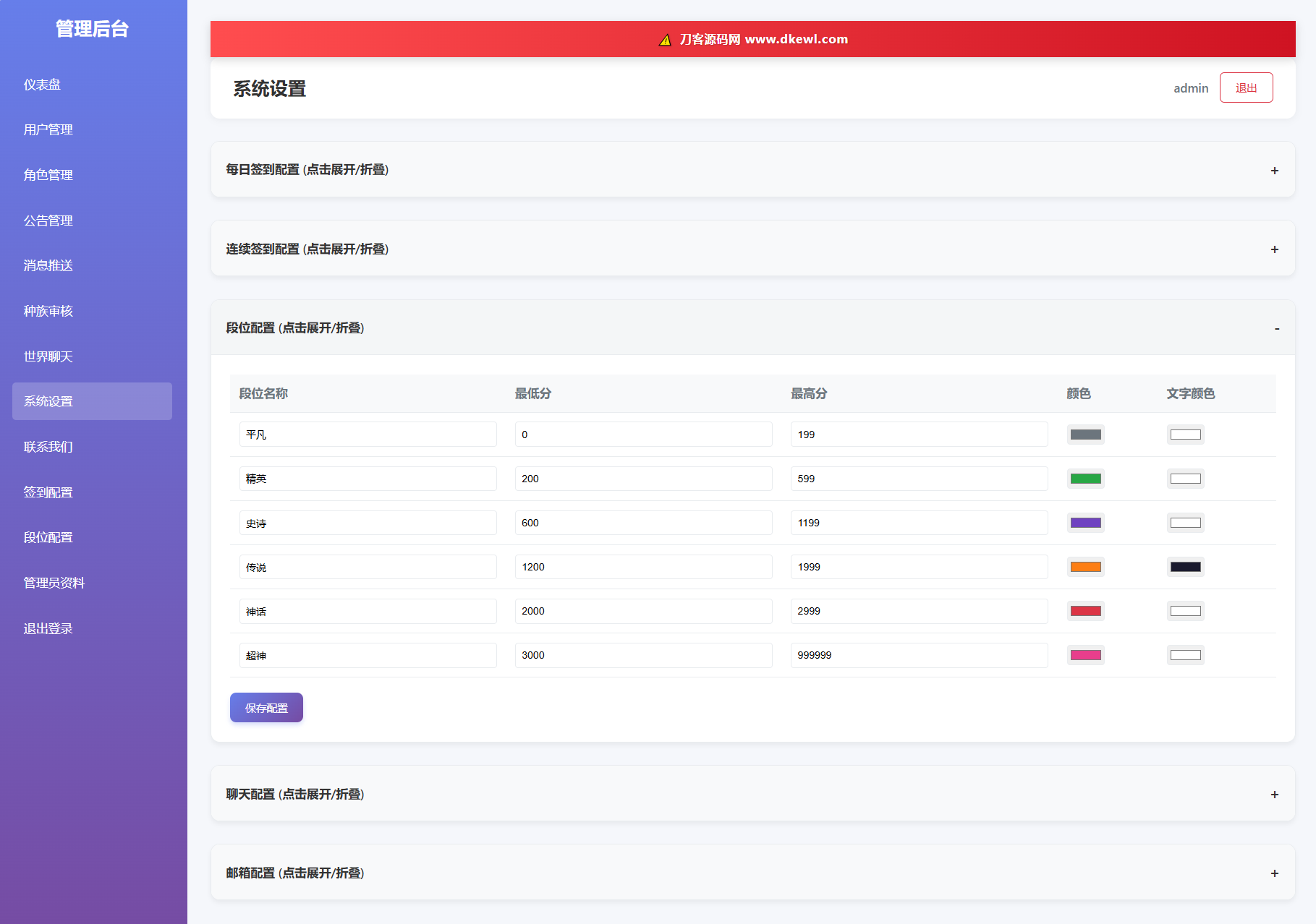 11. 段位配置 :设置不同战斗力区间的段位名称和图标。